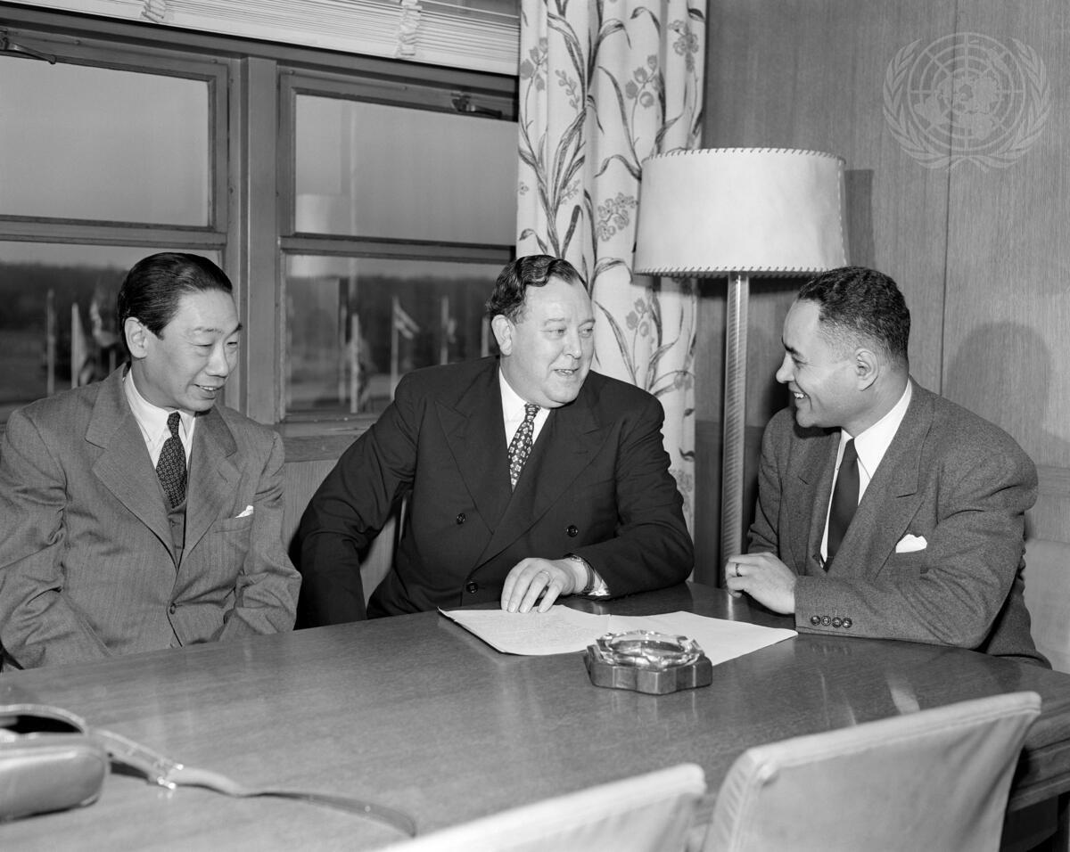 United Nations Secretary-General Trygve Lie, centre, discusses program of the first session of the Trusteeship Council with Dr. Victor Chi-Tsai Hoo, left, China, Assistant Secretary-General in charge of United Nations Department of Trusteeship and Information from Non-Self-Governing Territories, and Dr. Ralph J. Bunche, Director of the Trusteeship Division of the Department.