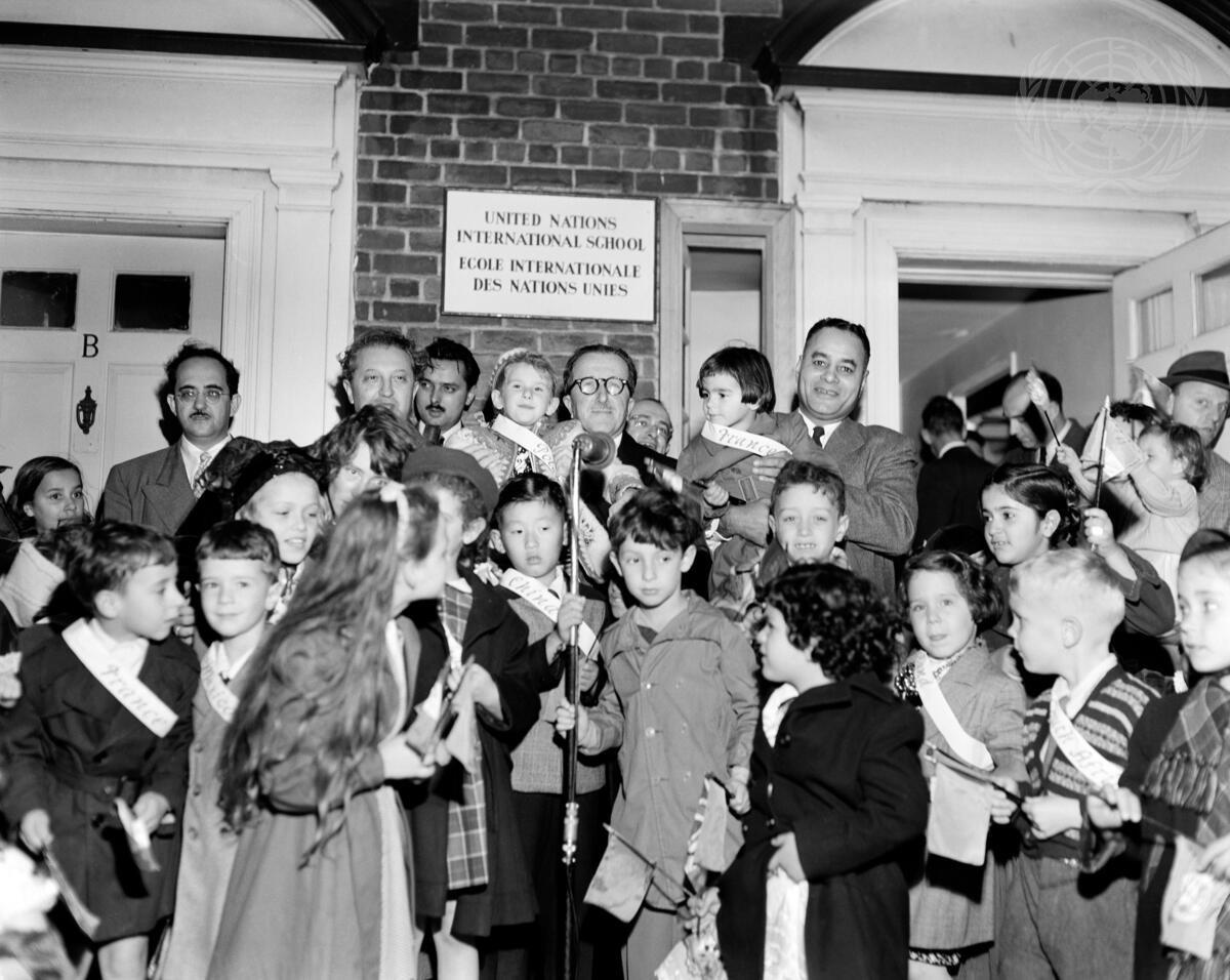 A United Nations flag was presented to children of the U.N. International School (UNIS) by Mr. Henri Laugier, (center, behind microphone) Assistant Secretary-General in charge of the Department of Social Affairs, in a ceremony outside the school building in Parkway Village, New York. The ceremony included a brief talk by Dr. Ralph J. Bunche (right), Director of the U.N. Department of Trusteeship and Information from Non-Self-Governing Territories.