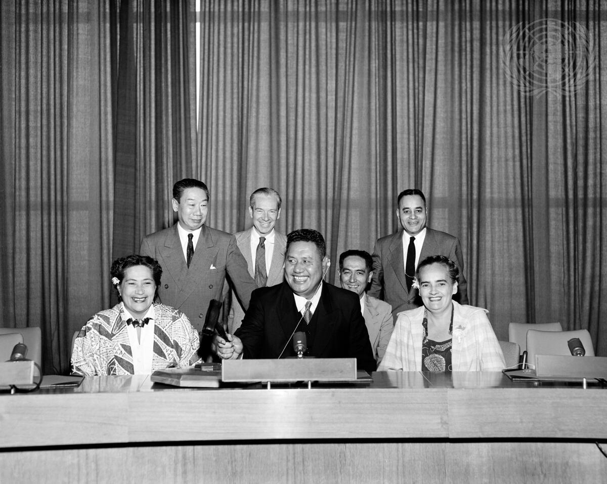 The Fautua (center), occupying the seat of the President of the Trusteeship Council, uses the gavel presented to the Council by Western Somoa. With the Fautua are (l. to r.): Mrs. Tamesese; Dr. Victor Hoo, Assistant Secretary-General of the U.N. in charge of the Department of Trusteeship and Information from Non-Self-Governing Territories; B. Aleksander, Deputy Director of the Division of Trusteeship; T. Cowan, of Rarotonga, Western Samoa; Ralph J. Bunche, Director of the Division of Trusteeship; and Mrs. Cowan, whose title is ""Makea Nui Teremoana Ariki"" is a member of the Rarotonga Island Council, and one of the leading ""Arikis"" of the Territory.