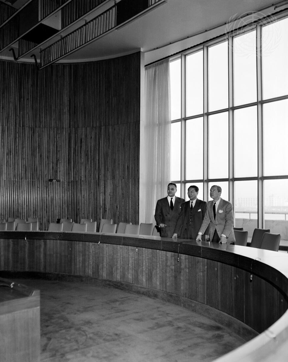 From left to right in the new Trusteeship Council chamber at United Nations Headquarters: Dr. Ralph Bunche, Principal Director of the Division of Trusteeship; Victor Hoo, Assistant Secretary-General in charge of the Department of Trusteeship & Information from Non-Self-Governing Territories; and Bodizar Aleksander, Deputy Director of the Division of Trusteeship.