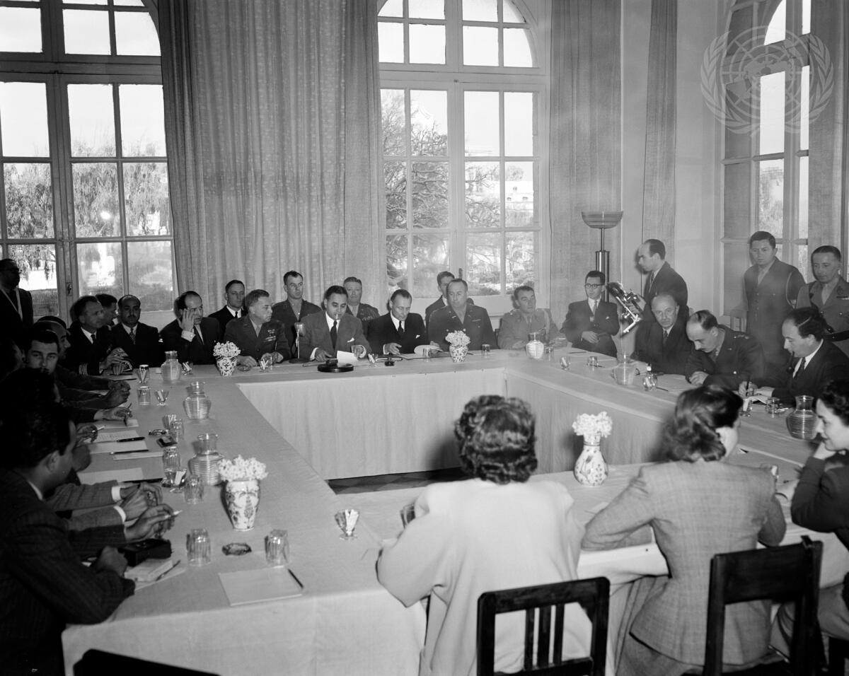 At the Hôtel des Roses, on the Greek Island of Rhodes, Dr. Ralph J. Bunche (centre), United Nations Acting Mediator, reads the Agreement. Facing camera, from left to right, are: Mr. Constantine Stavropoulus, of UN Legal Department; US Brig. General William O. Riley, Chief of U.N. Palestine Military Observers; Dr. Bunche; Mr. Henri Vigier, of the Executive Office of the U.N. Secretary-General; and U.N. Palestine Military Observers Col. Millett and Col. Langlois. At left side of table is Egyptian delegation and at the right is the Israeli delegation.