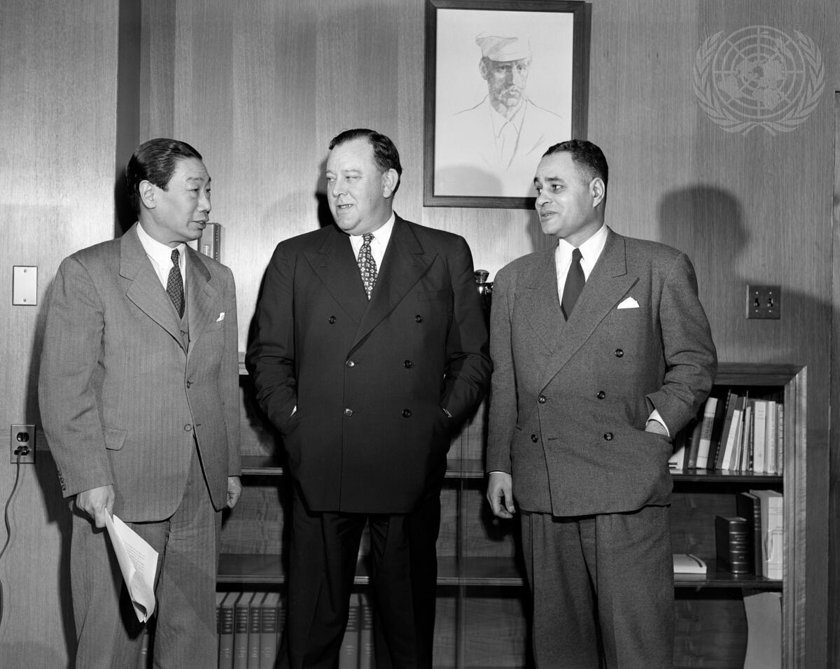 United Nations Secretary-General Trygve Lie, centre, Victor Chi-Tsai Hoo, left, China, Assistant Secretary-General in charge of United Nations Department of Trusteeship and Information from Non-Self-Governing Territories, and Dr. Ralph J. Bunche, Director of the Trusteeship Division of the Department.
