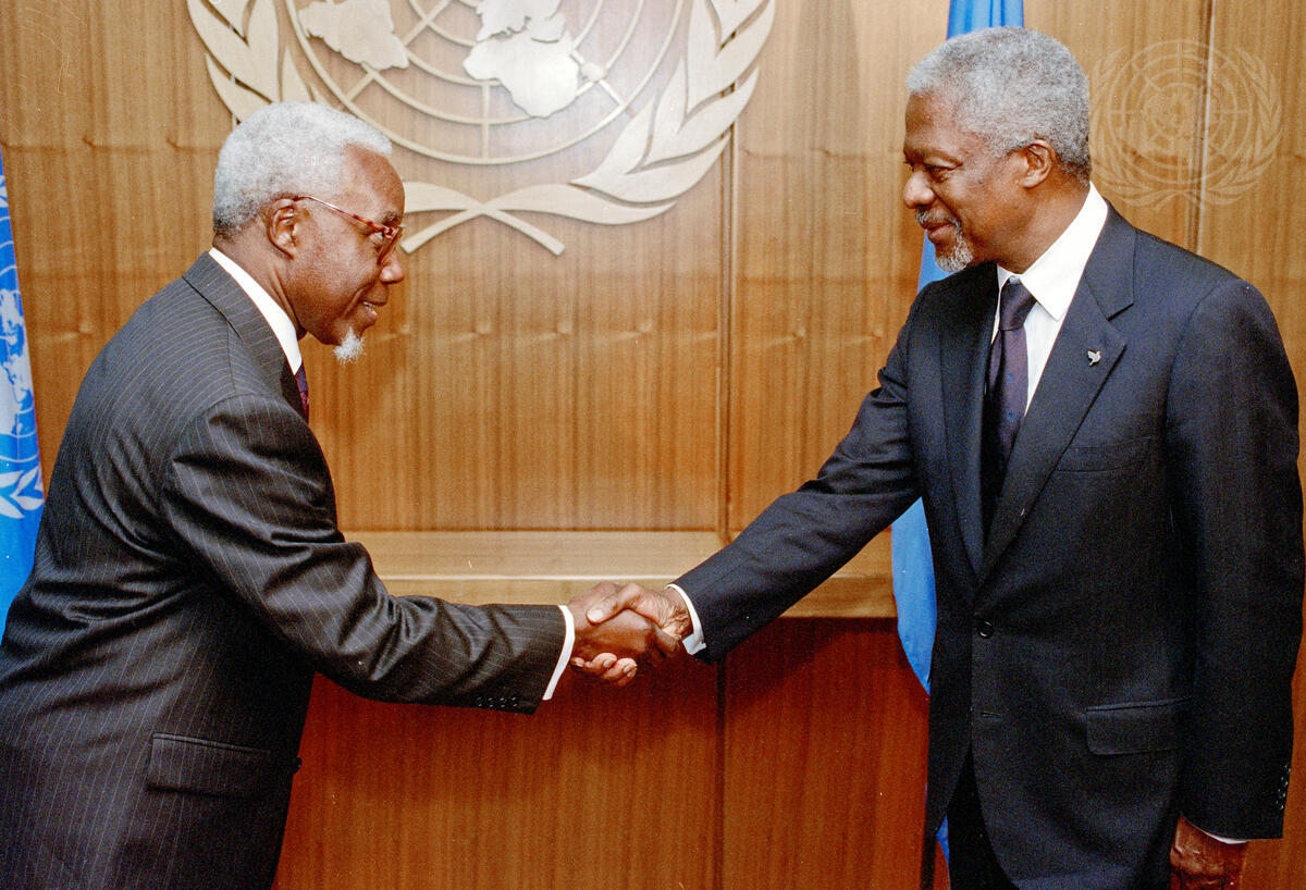 Ismael Abraão Gaspar Martins (left), the new Permanent Representative of Angola to the United Nations, presents his credentials to Secretary-General Kofi Annan.