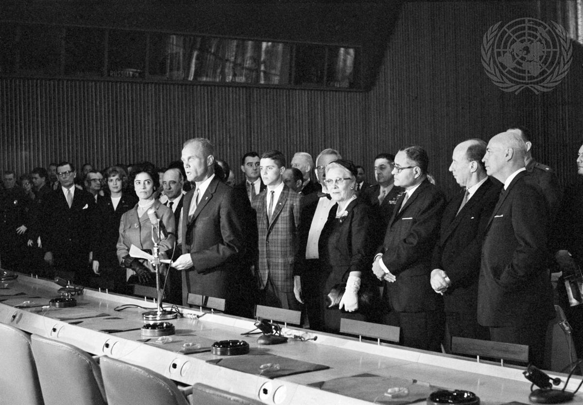 Col. Glenn (at microphone) delivering a short address to a gathering in the Economic and Social Council Chamber during his tour of Headquarters. Standing at left is his wife, Mrs. John H. Glenn, Jr. and, at right, their son David. Others in the front row are (left to right) the Astronaut's parents, Mr. and Mrs. John H. Glenn, Sr.; Dr. Bunche; Ambassador Adlai E. Stevenson, Permanent Representative of the United States to the UN; and Dr. Robert R. Gilruth, Manager of Project Mercury.