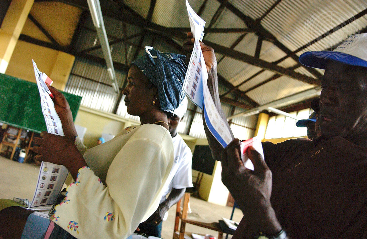 Voters inspecting ballots papers on election day, today in Montserrado, Liberia.