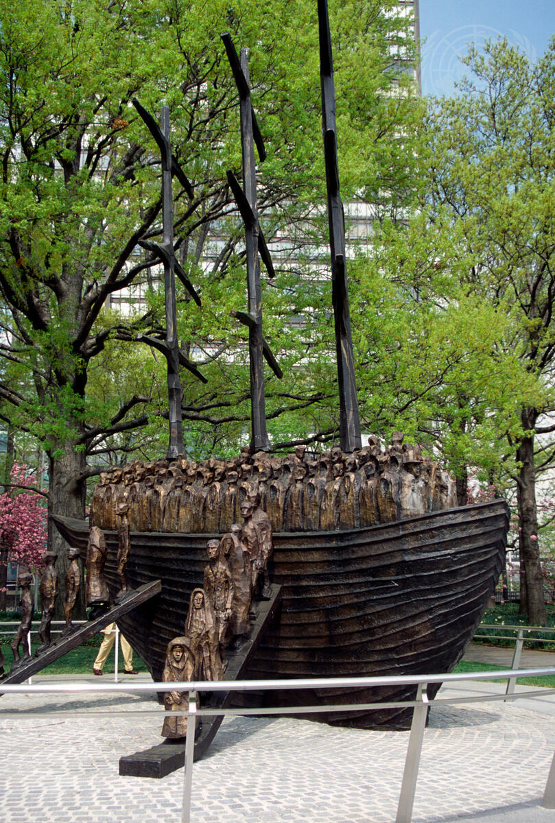 A view of the sculpture ""Arrival"" by John Behan, a gift from the people of Ireland to the United Nations. In the background are the cherry blossoms in full bloom. [No exact date]