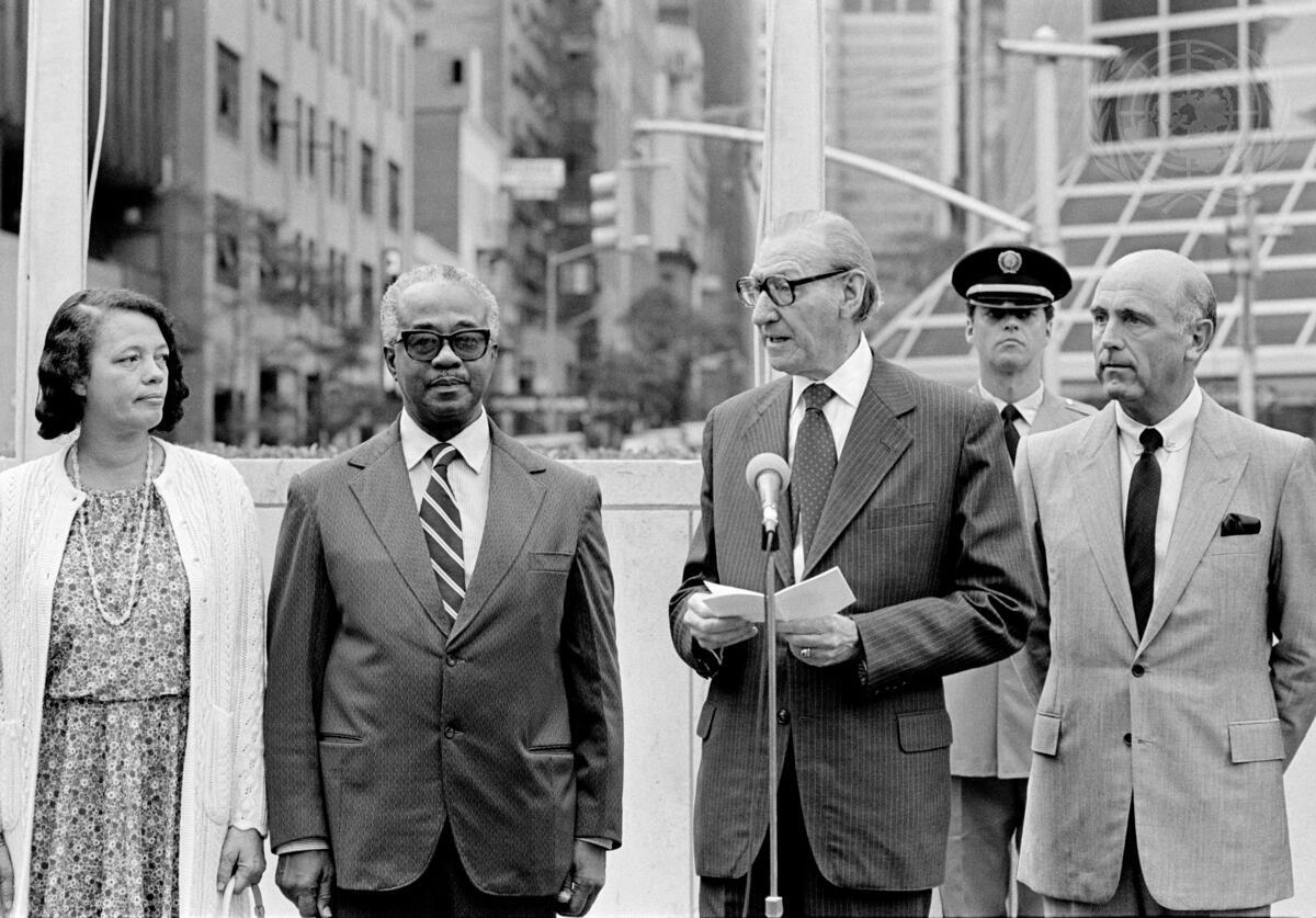 Secretary-General Kurt Waldheim (at microphone) speaking today at the UN Headquarters flag raising ceremony for Saint Vincent and the Grenadines. That country yesterday became the 154th Member State of the United Nations. Flanking the Secretary-General are, at left, Robert Milton Cato, Prime Minister of Saint Vincent and the Grenadines and Mrs. Cato, and at right, Rudiger von Wechmar, President of the General Assembly.