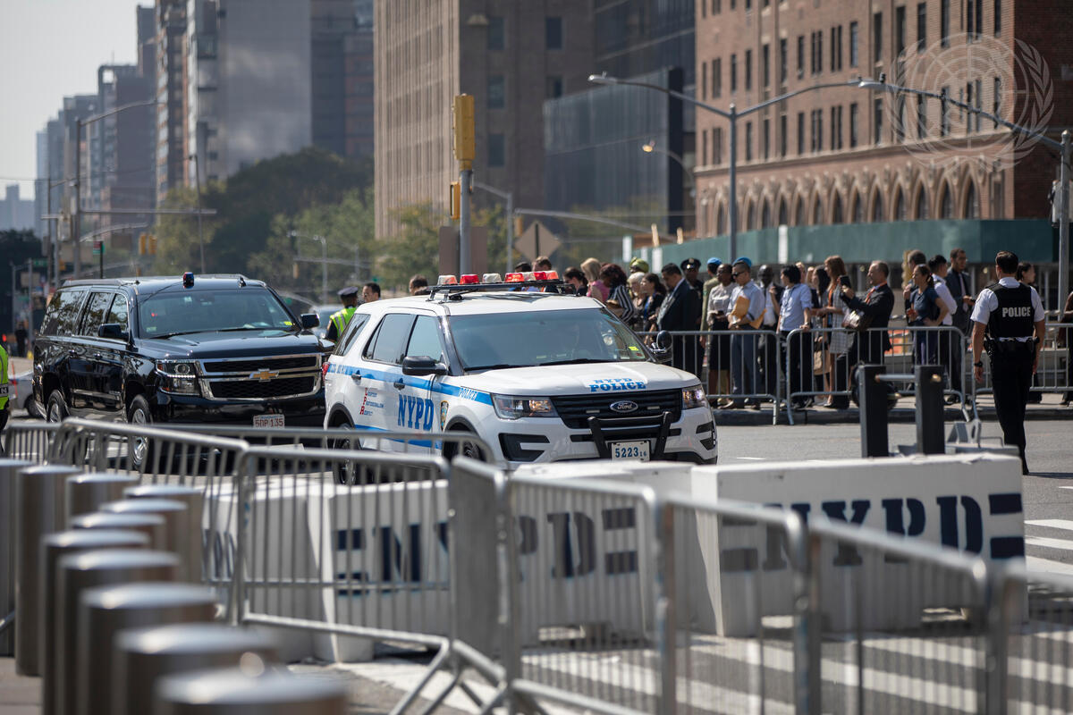 "A view of a New York Police Department car and people trying to cross First Avenue outside the UN headquarters during the UN Climate Action Summit 2019.
