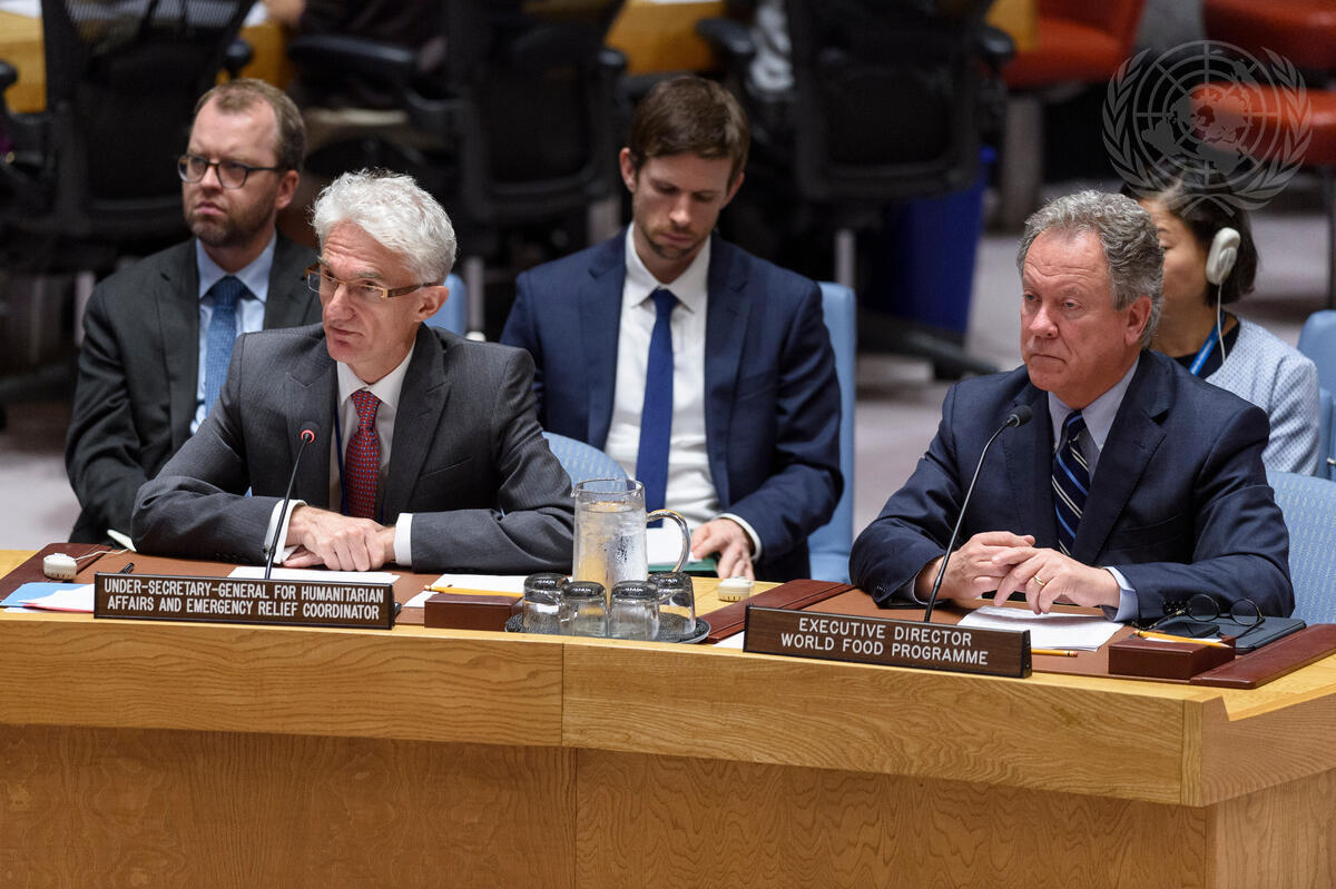 Mark Lowcock (left), Under-Secretary-General for Humanitarian Affairs and Emergency Relief Coordinator, briefs the Security Council on the situation in the Middle East (Yemen). At right is David Beasley, Executive Director of the United Nations World Food Programme (WFP).