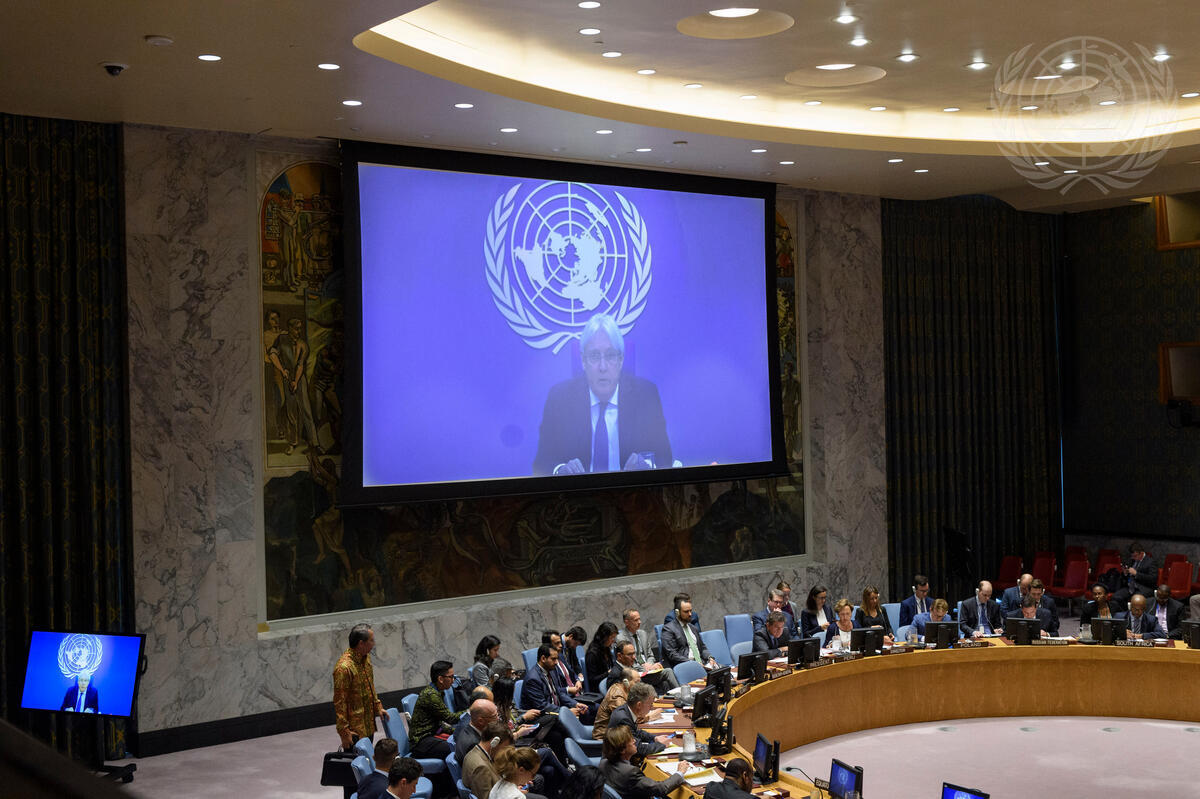 Martin Griffiths (on screen), Special Envoy of the Secretary-General for Yemen, briefs the Security Council on the situation in the Middle East (Yemen).