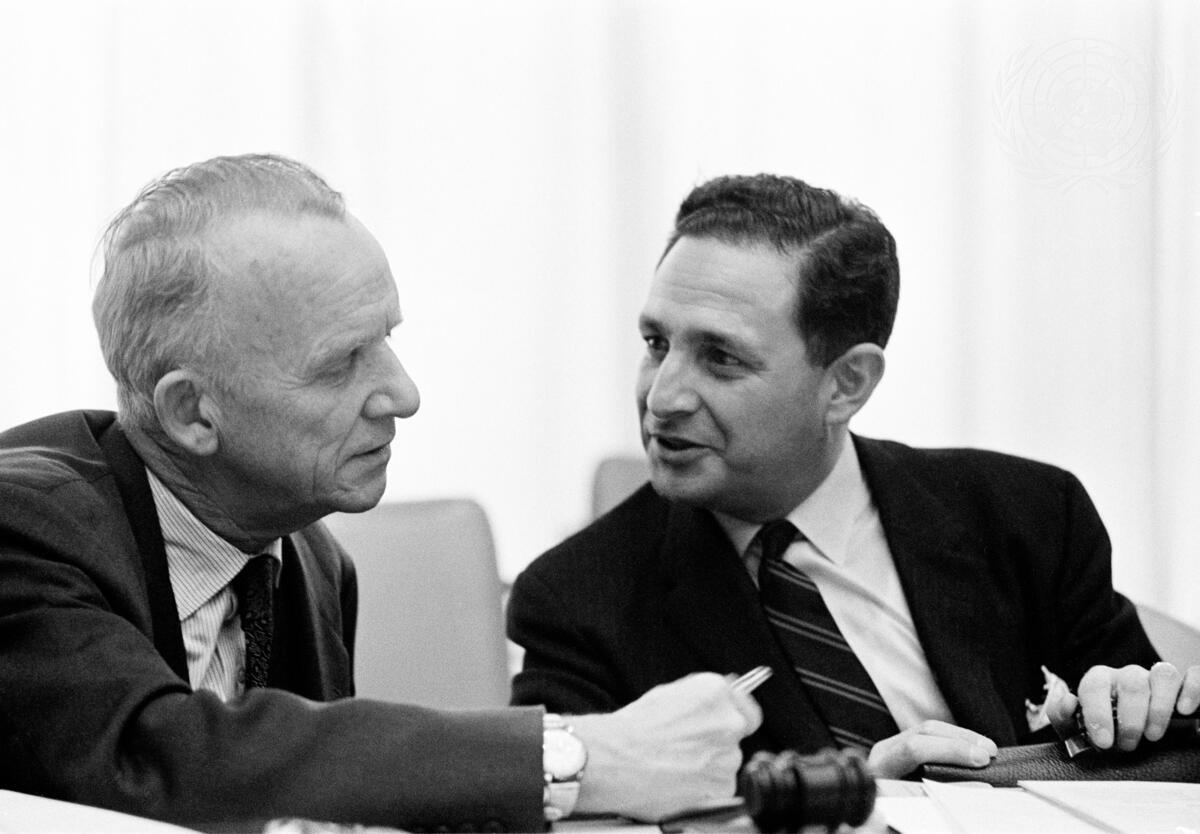 Mr. John P. Humphrey (left), Director of the UN Division of Human Rights, conversing with Dr. Enrique Ponce Carbo (Ecuador), Chairman.