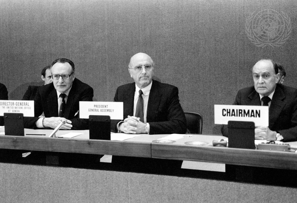 Rudiger von Wechmar (FRG), President of the General Assembly, is seen at the center addressing the Commission today. He is flanked at left by Luigi Cottafavi, Director General of the UN Office at Geneva, and at right by newly elected Commission Chairman Carlos Calero-Rodrigues (Brazil).