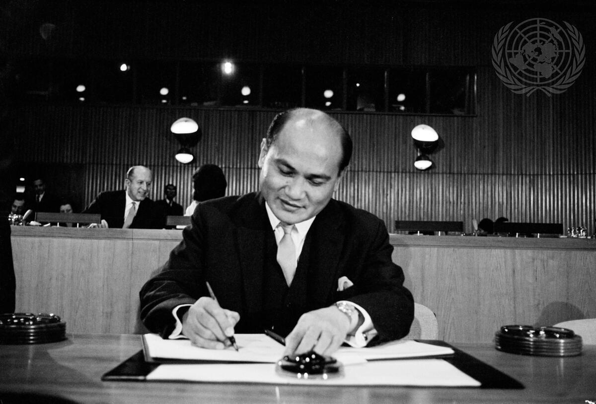 Ambassador Salvador P. Lopez (Philippines) is seen signing the Covenants.
