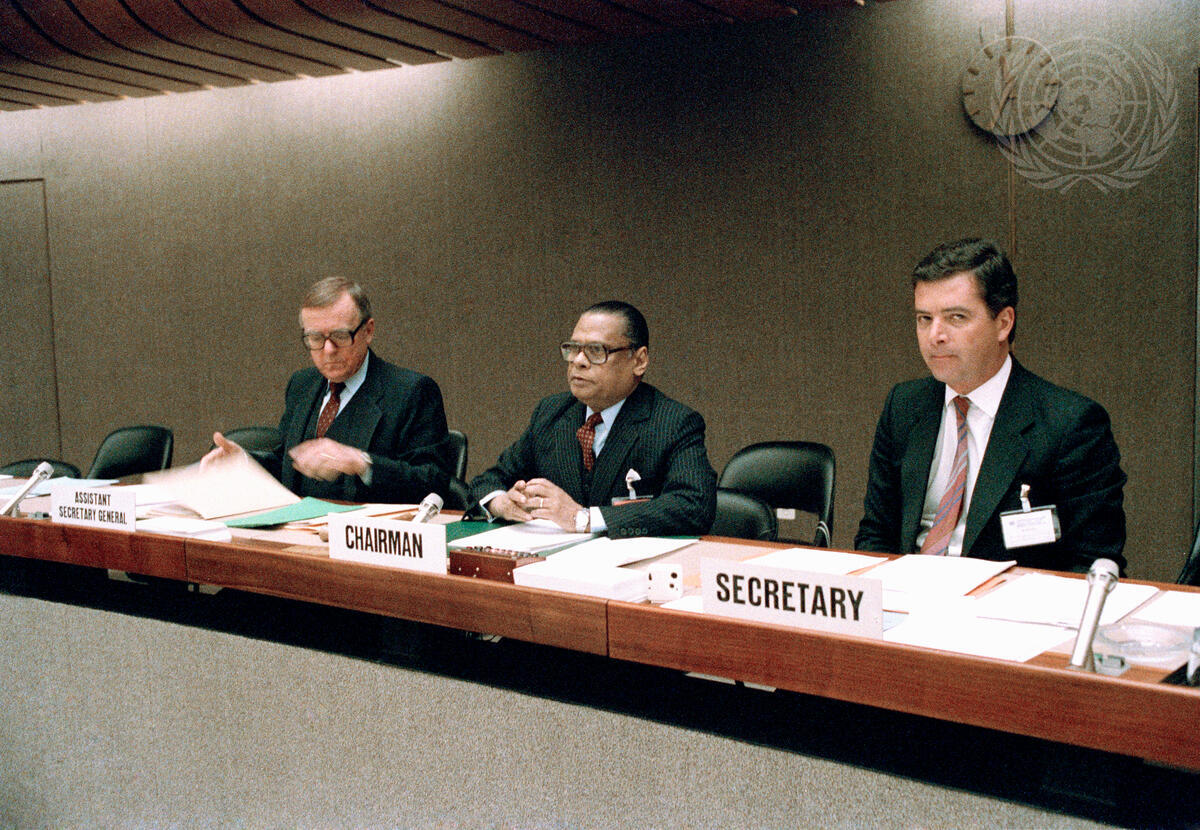 The Commission of Human Rights began its forty-second session at the Palais des Nations, Geneva, on 3 February. At the presiding table are (left to right): Kurt Herndl, Assistant Secretary General for Human Rights; Hector Charry-Samper (Colombia), Chairman; and John Pace, Secretary.