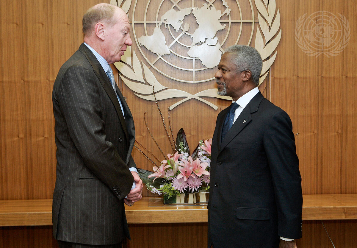 Secretary-General Kofi Annan (right) meets with E. Neville Isdell, Chairman of the Coca-Cola Company, today at UN Headquarters in New York.