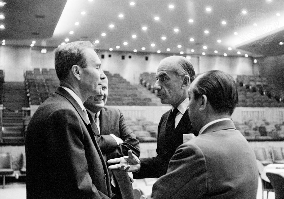 The UN Security Council met tonight to discuss the fourth report by the Secretary General on the situation in the Congo, and the Yugoslav request for consideration of this situation. Exchanging views shortly before today's meeting opened are (left to right): V.V. Kuznetsov (USSR), First Deputy Minister for Foreign Affairs; Platon D. Morozov (USSR); Egidio Ortona (Italy), Council President for the current month; and Mongi Slim (Tunisia).