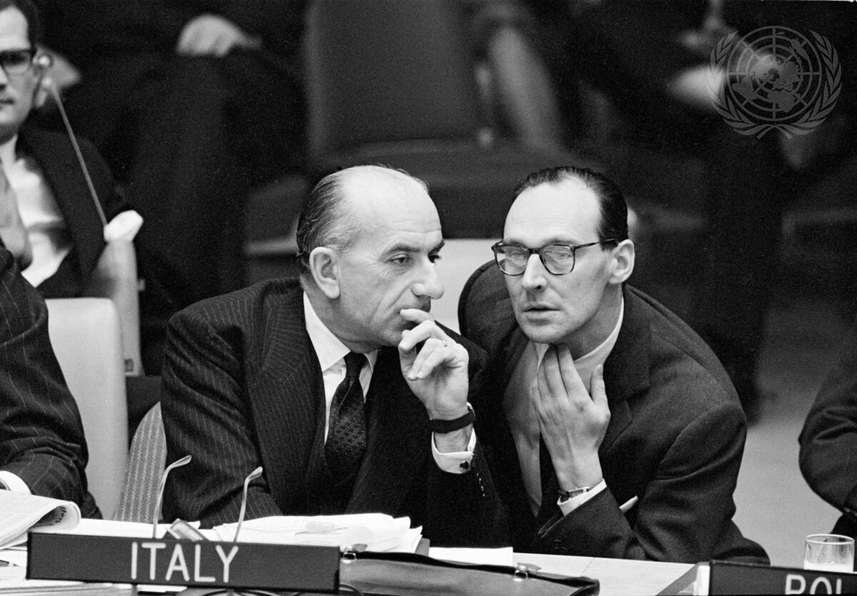 Egidio Ortona, Permanent Representative of Italy to the UN, is seen (left) exchanging views with the David Ormsby-Gore, Minister of State for Foreign Affairs of the United Kingdom.