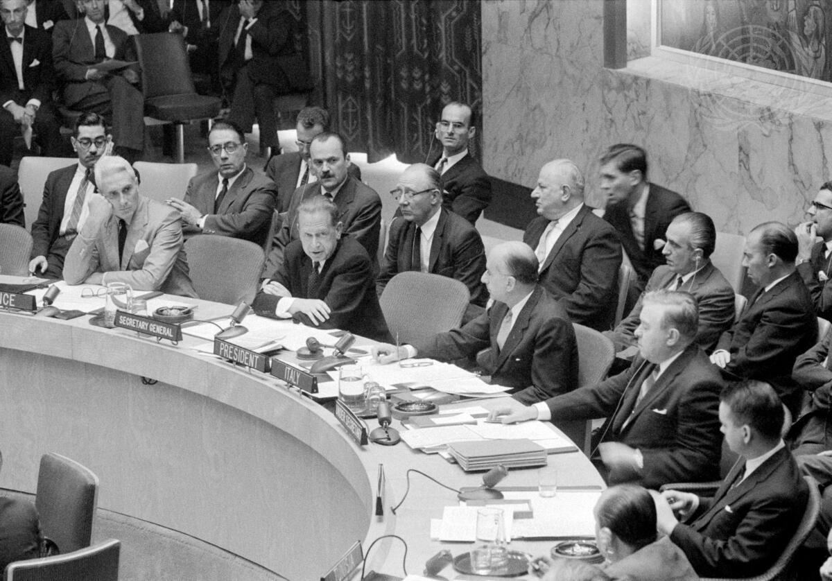 UN Secretary General Dag Hammarskjöld addresses the Council. Seen in this view of the Council table are (front row, left to right): M. Armand Berard (France); Mr. Hammarskjöld, speaking; M. Egidio Ortona (Italy), Council President for the current month; Mr. G.P. Arkadev, Under-Secretary for Political and Security Council Affairs; and Mr. Bohdan Lewandowski (Poland).