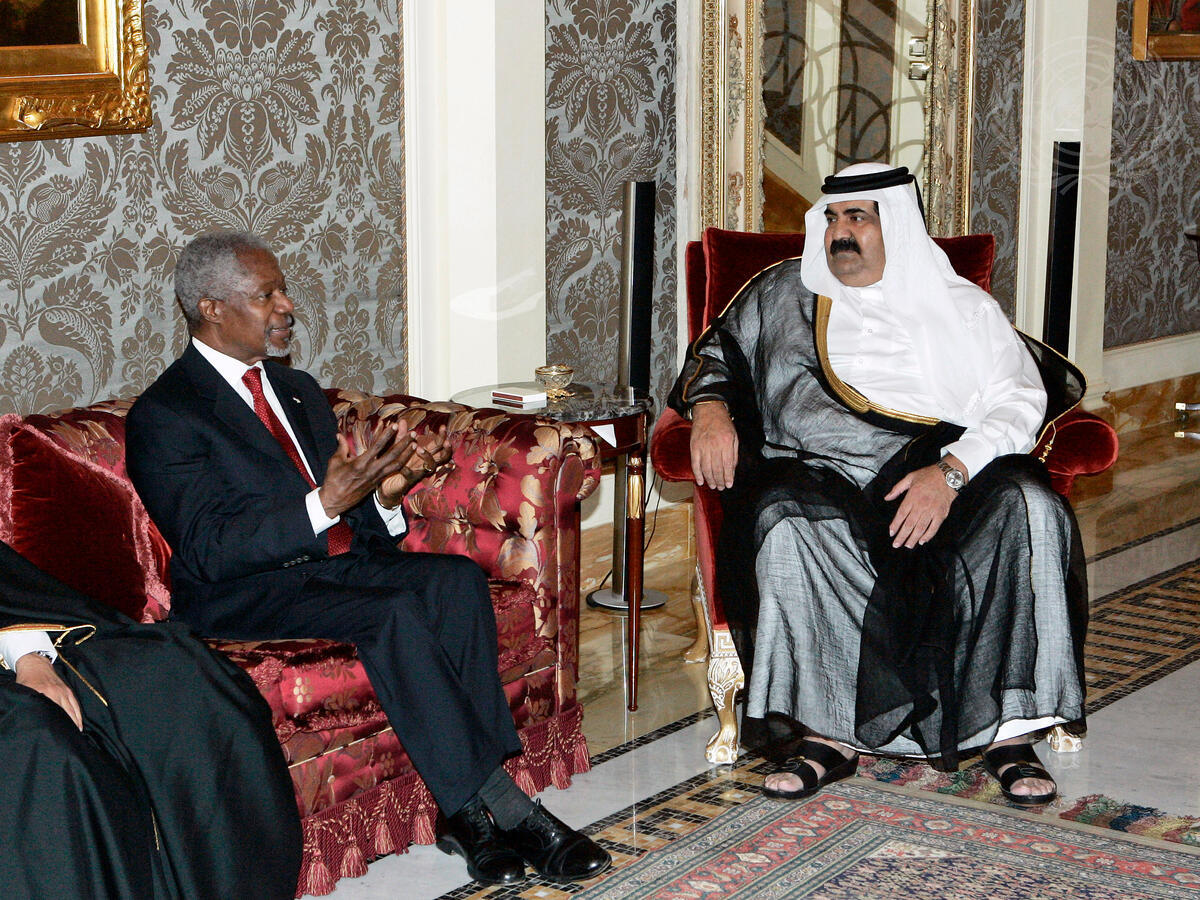 Secretary-General Kofi Annan (left) meets with Sheikh Hamad bin Khalifa Al-Thani, Emir of the State of Qatar, today in Doha, Qatar.