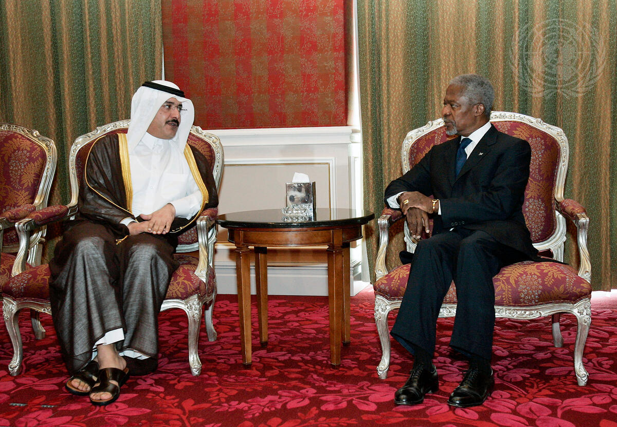 Secretary-General Kofi Annan (right) meets with Sheikh Abdullah bin Khalifa Al-Thani, Prime Minister of the State of Qatar, today in Doha, Qatar.
