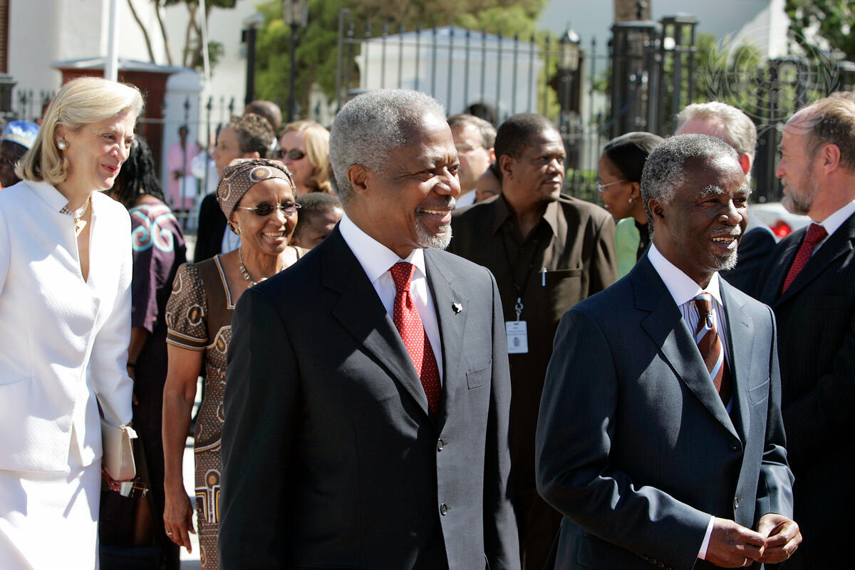 Secretary-General Kofi Annan (left, front) and Thabo Mbeki (right, front), President of the Republic of South Africa, at Tuynhuys, the Presidential Palace in Cape Town. Also present is Mrs. Nane Annan (left, back).