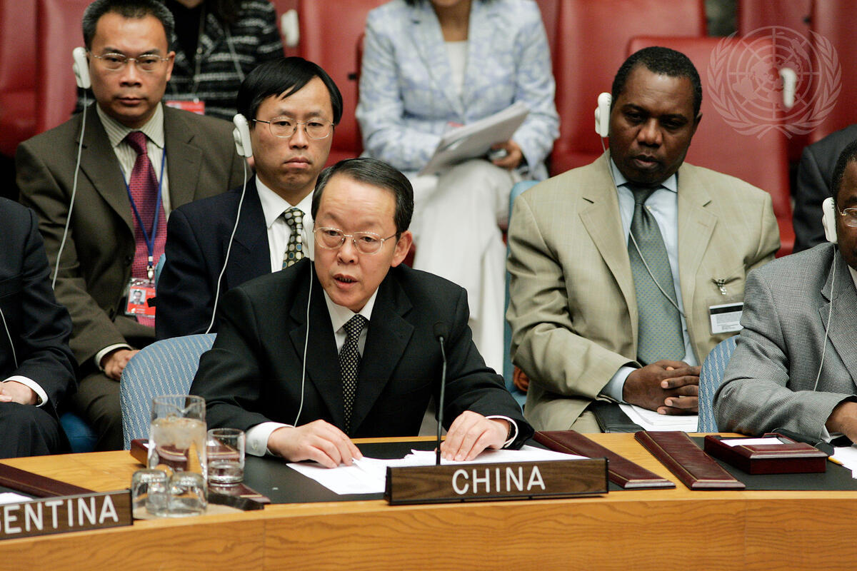 Wang Guangya (left), Permanent Representative of the People's Republic of China to the United Nations, addresses the Security Council meeting that unanimously condemned the claim by the Democratic People's Republic of Korea (DPRK) that it had conducted a nuclear weapon test and imposed sanctions on the DPRK, calling for it to return immediately to multilateral talks on the issue, at UN Headquarters in New York.