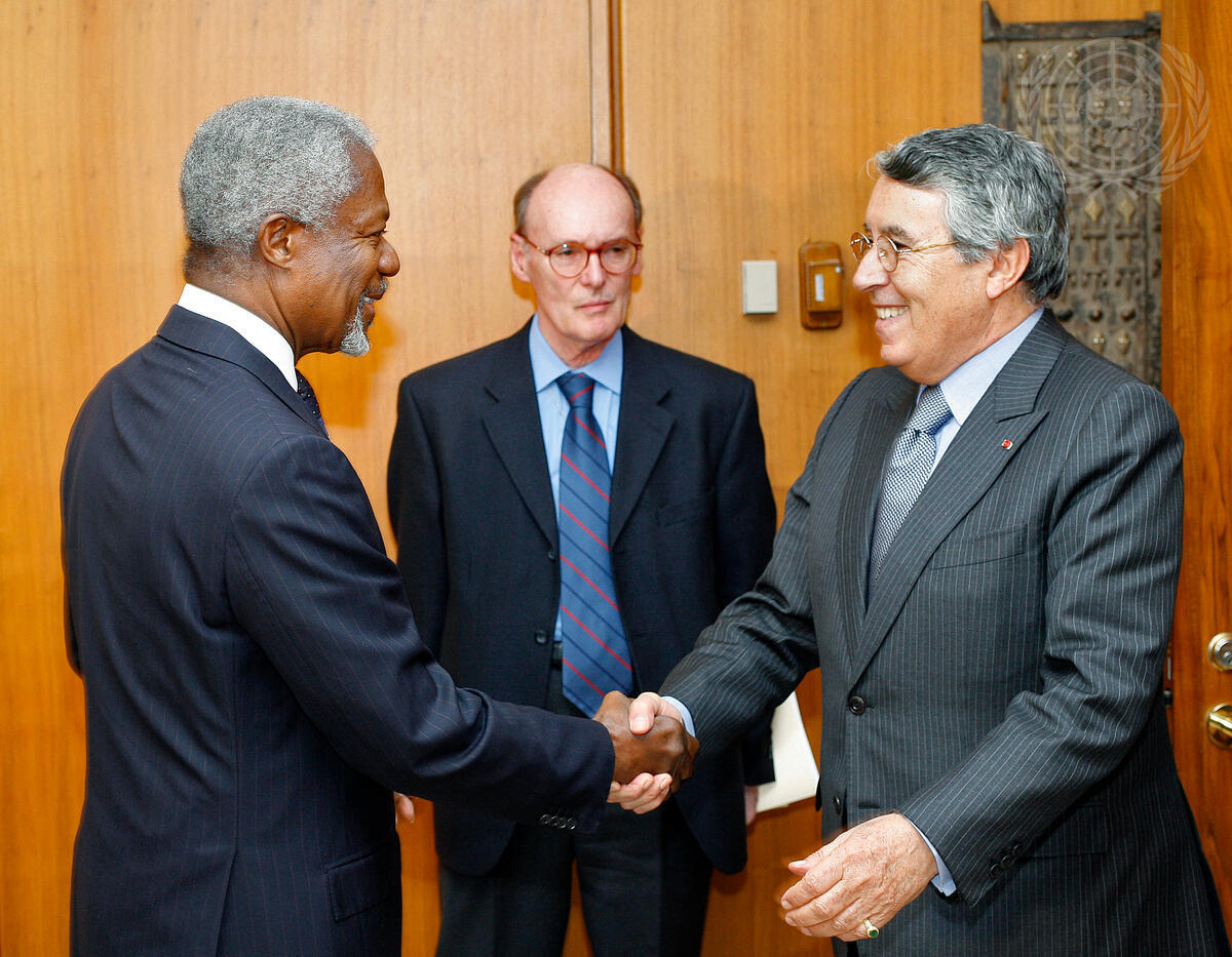 Secretary-General Kofi Annan (left) meets with Mohamed Benaissa (right), Foreign Minister of Morocco, at UN Headquarters in New York.