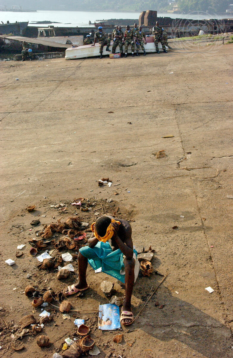 A homeless young orphan of the Sierra Leone war sits on a pile of rubbish at the ferry port in Lungi, Sierra Leone, as the last Nigerian contingent of the United Nations Mission in Sierra Leone, (UNAMSIL) in the background, awaits the ferry to the airport, at the end of tour of duty.