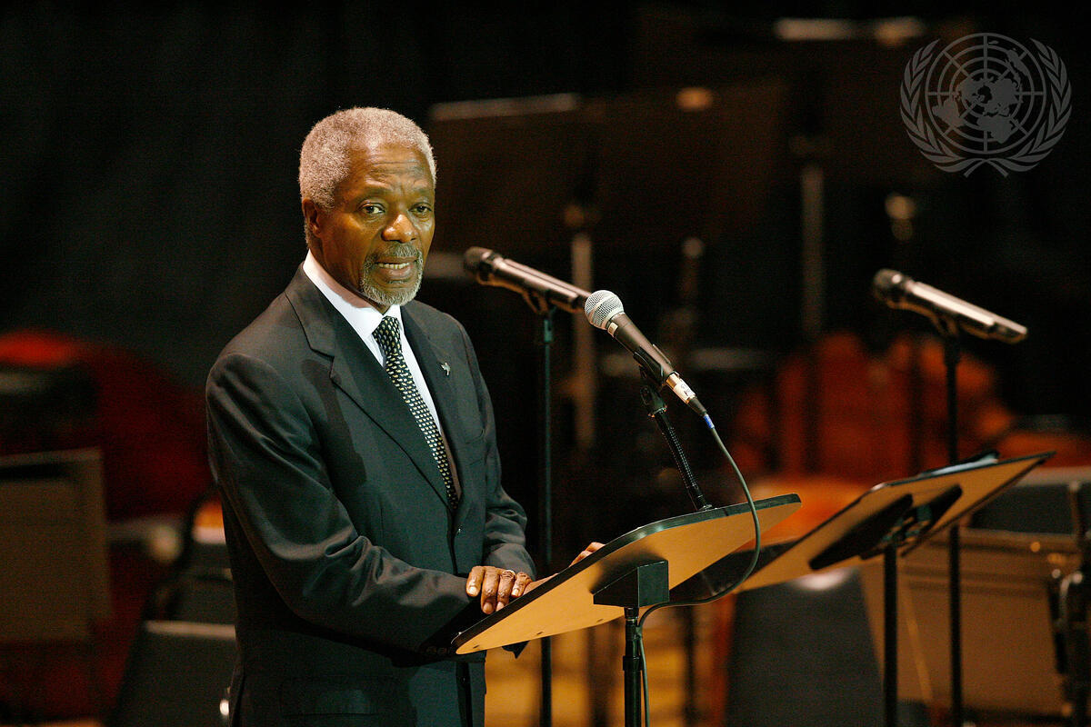 Secretary-General Kofi Annan speaks at the United Nations Day Concert he hosted, featuring the 62-member National Symphony Orchestra of Greece, at UN Headquarters in New York.