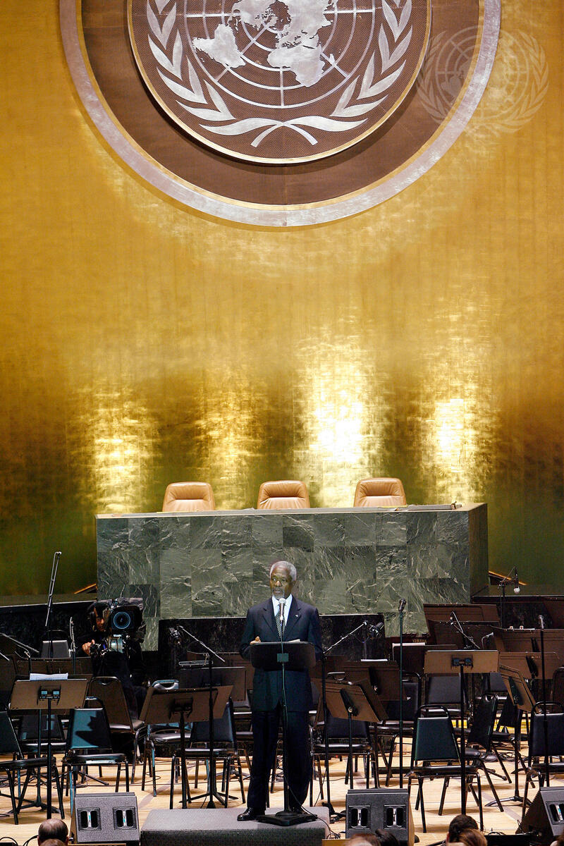 Secretary-General Kofi Annan speaks at the UN Day concert he hosted with Mrs. Annan, featuring the 62-member National Symphony Orchestra of Greece, at UN Headquarters in New York.