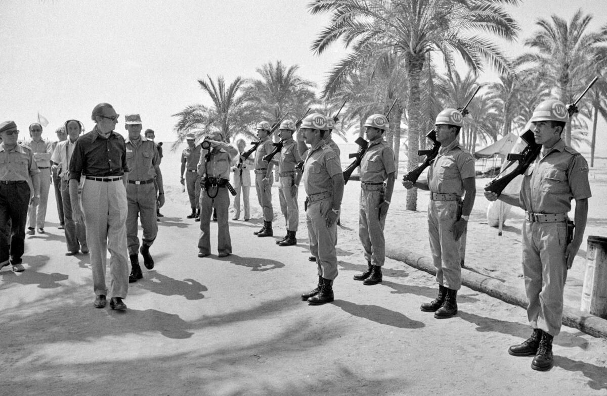 Secretary-General during his visit to the headquarters of the Peruvian Battalion with UNEF at Rabah in Sinai. Escorting him at right is Lt. Col. C. Hart, Commanding Officer of the Peruvian Battalion. At left is General Ensio Siilasvuo, UNEF Commander.