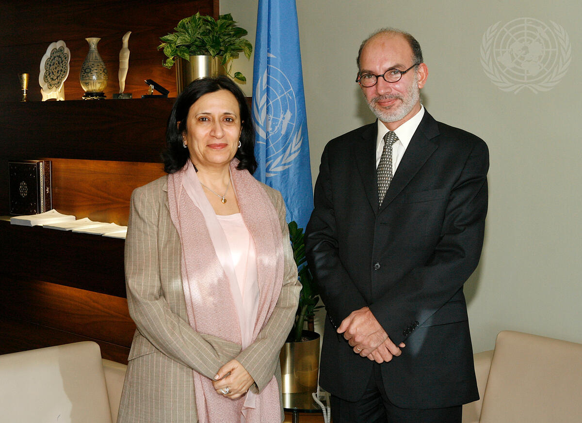 General Assembly President Haya Rashed Al Khalifa (left) meets with Luis Alfonso de Alba, President of the Human Rights Council in Geneva, at UN Headquarters in New York.