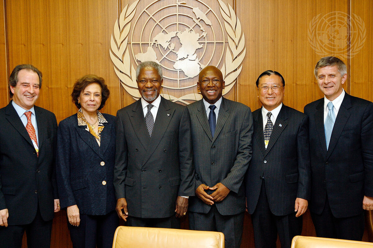 Secretary-General Kofi Annan (third from left) meets with (left to right) José Luis Machinea, Executive Secretary of the United Nations Economic Commission for Latin America and the Caribbean (ECLAC); Mervat M. Tallawy, Executive Secretary of the United Nations Economic and Social Commission for Western Asia (ESCWA); Mr. Annan; Abdoulie Janneh, Executive Secretary of the United Nations Economic Commission for Africa (ECA); Kim Hak-Su, Executive Secretary of the United Nations Economic and Social Commission for Asia and the Pacific (ESCAP); and Marek Belka, Executive Secretary of the United Nations Economic Commission for Europe (ECE), at UN Headquarters in New York.