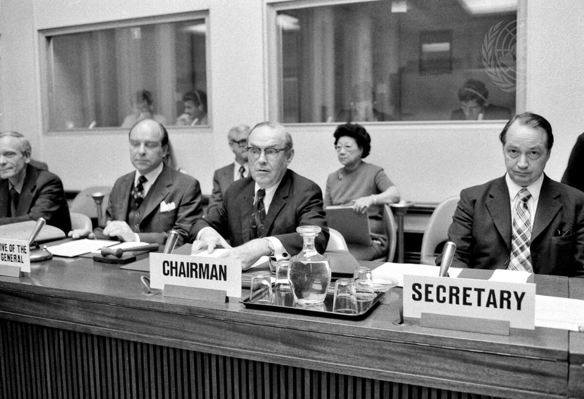 At the presiding table, from left: Lev L. Issaev, Representative of the Director-General, International Atomic Energy Agency (IAEA); Ilkka Pastinen, Special Representative of the U.N. Secretary-General, C.C.D; William Barton (Canada); and Rolf G. Bjornerstedt, Secretary.