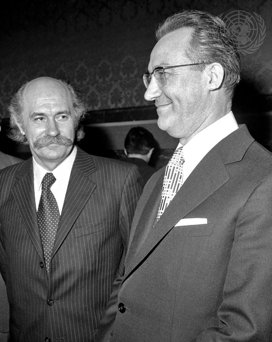 At a reception given by the Government of Romania are Janez Stanovnik (left), Executive Secretary of Ece, and Manea Manescu, Prime Minister of Romania.