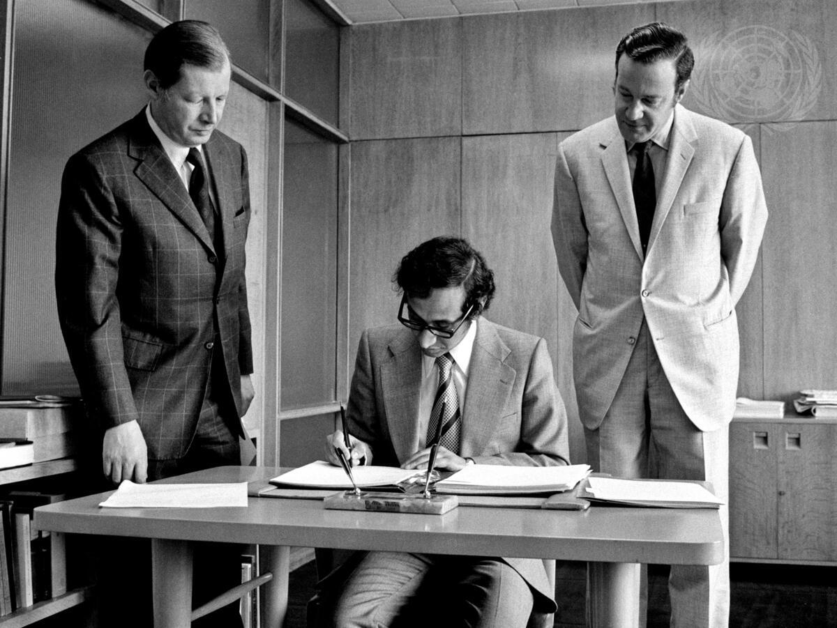 The Permanent Representative of Jordan at the United Nations, Ambassador Sherif Abdul Hamid Sharaf, is seen signing the Convention today. Looking on are Mr. P. Giblain (left), Chief of the Treaty Section, UN office of Legal Affairs, and Mr. Erik Suy, Under-Secretary-General UN Office of Legal Affairs.