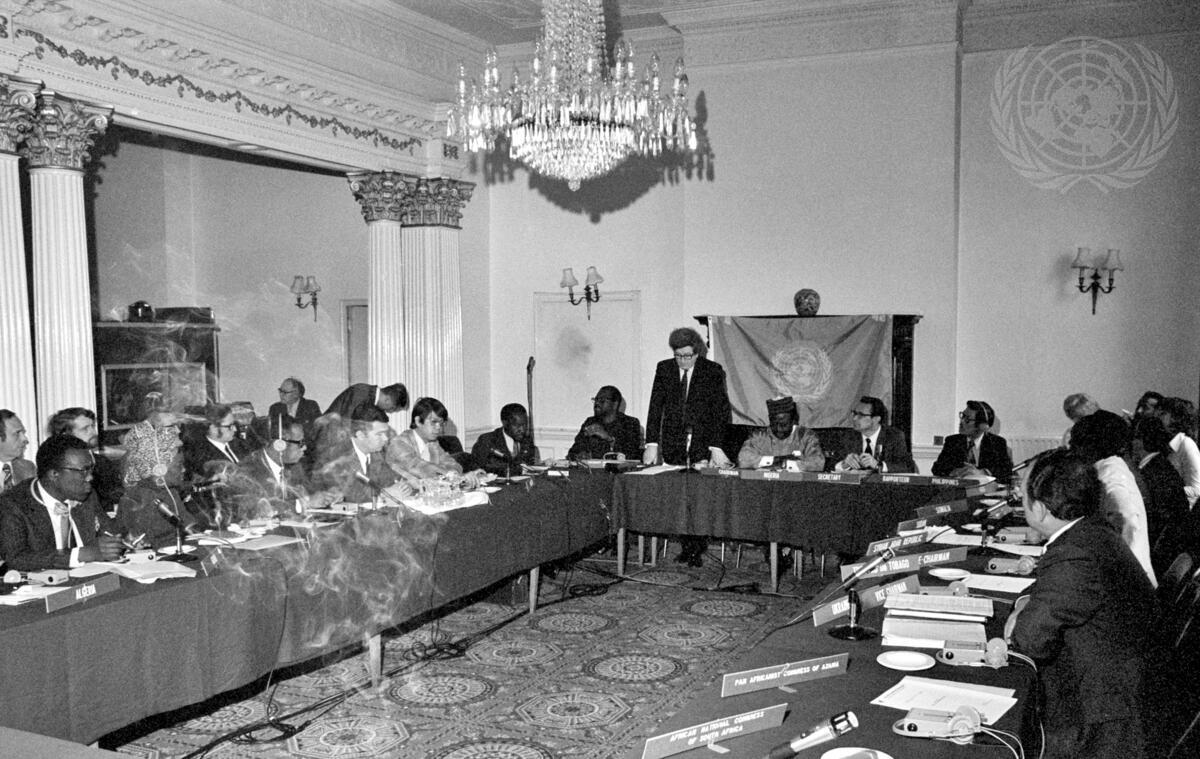 Garret Fitzgerald, Foreign Minister of Ireland, welcomes the Committee at its first public meeting held at the Shelbourne Hotel in Dublin. Participants in the Committee's meeting included the President of U.N. Council for Namibia, Rashleigh E. Jackson (Guyana), and representatives of anti-apartheid movements and trade union and student organizations as well as the Organization of African Unity and the Pan-Africanis Congress of Azania, one of the South African Liberation movements.