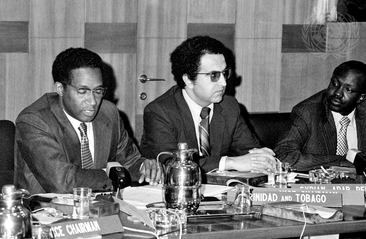 Mr. E. Seignoret (Trinidad and Tobago, Vice-Chairman of the Committee, making a statement at a meeting held at the headquarters of the Food and Agriculture Organization (FAO) in Rome, with labour, youth and other non-governmental organizations participating. At centre is Mr. Najdi Jazzar (Syria), and at right is Mr. Abdi Yusuf (Somalia).