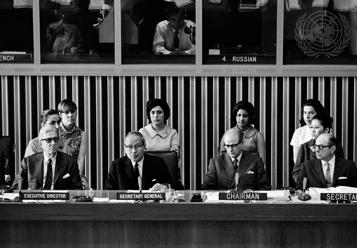 Secretary-General U Thant is seen addressing the 30-nation Executive Board of the United Nations Children's Fund (UNICEF). At the presiding table, from left: Mr. Henry R. Labouisse, Executive Director of UNICEF; Mr. Nils Thedin (Sweden), Chairman; and Mr. John Charnow, Secretary, UNICEF Executive Board and Chief, NGO Liaison Office.
