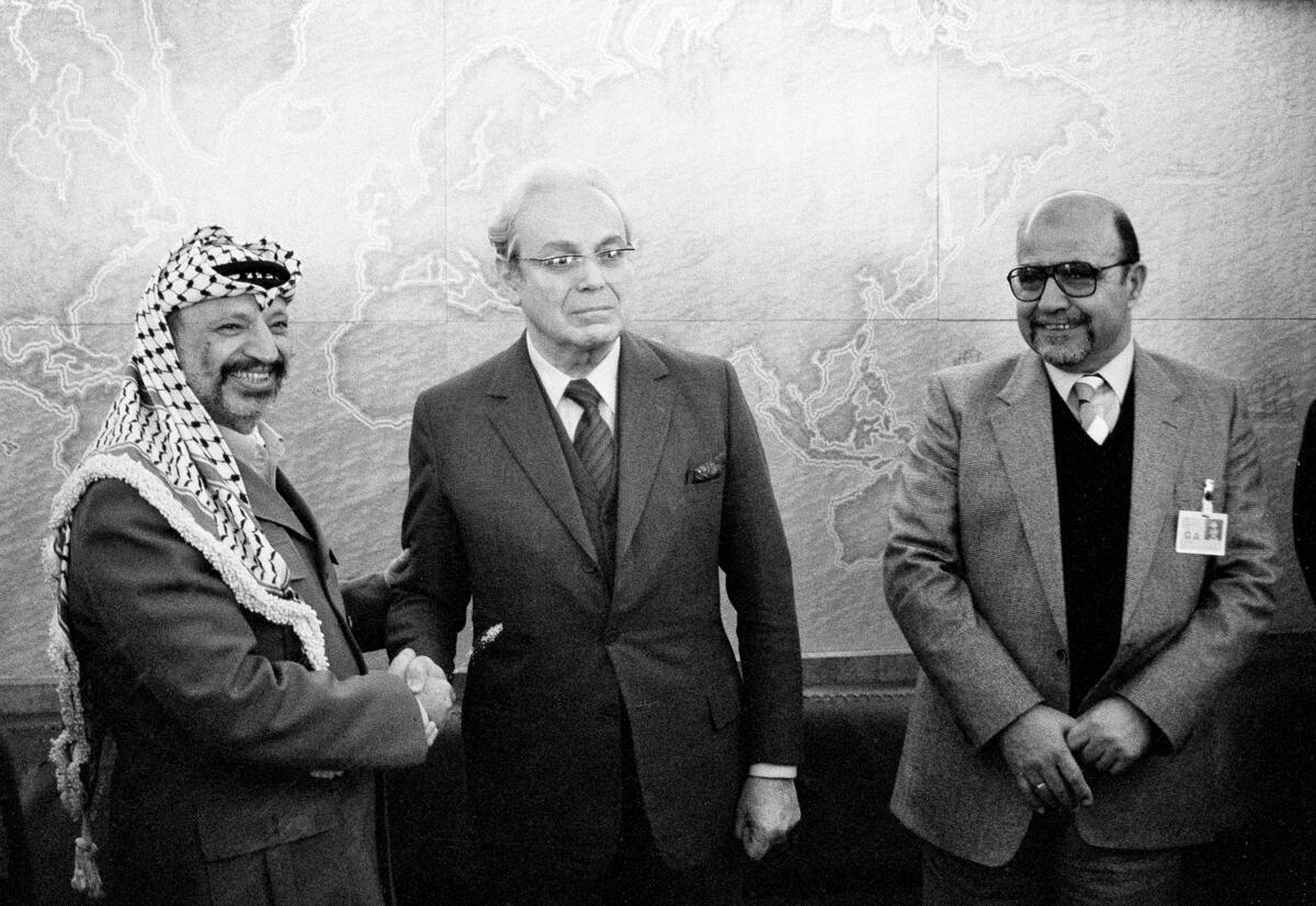 Secretary-General Javier Perez de Cuellar (center) greeting Chairman Yasser Arafat (left) at the United Nations in Geneva today.