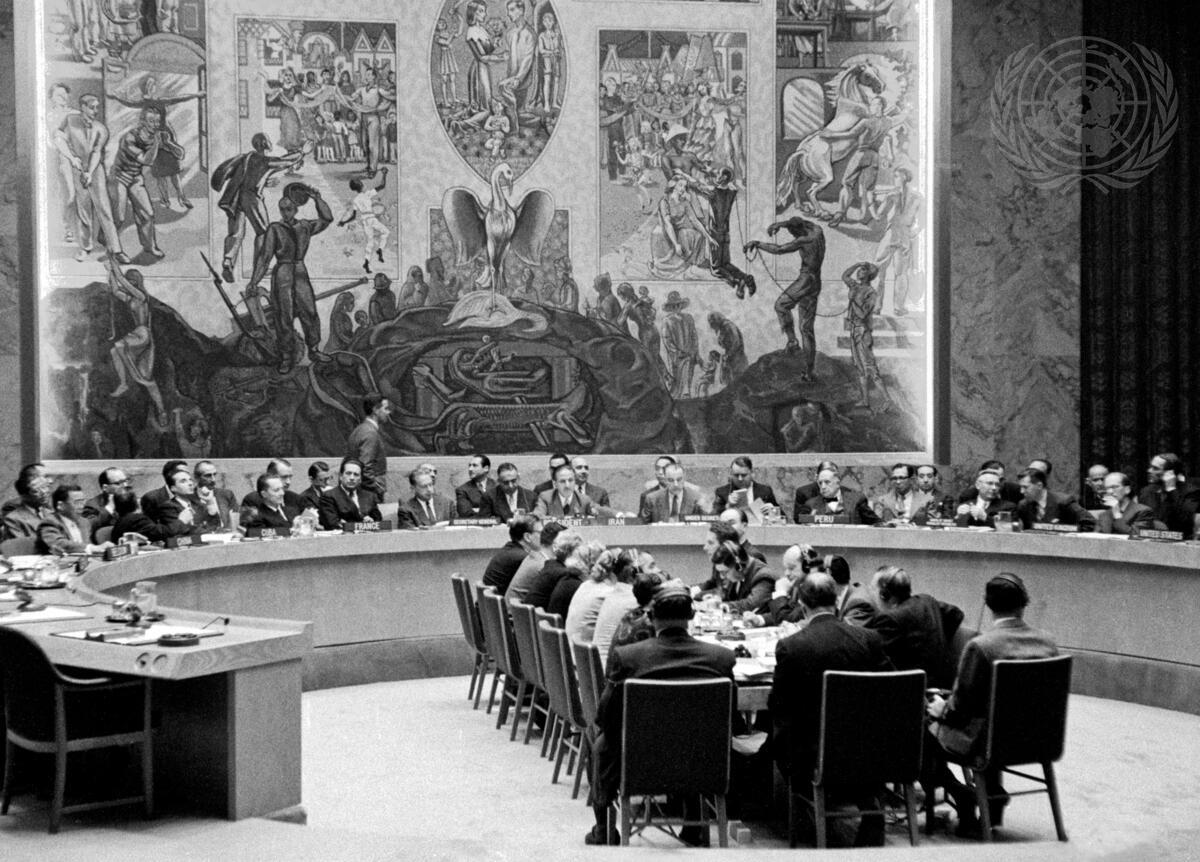 Here is a partial view of the meeting, showing seated left to right at the Council table: Dr. Victor A. BELAUNDE, of Peru; Mr. Arkady A. SOBOLEV, of the Soviet Union; Sir Pierson DIXON, of the United Kingdom; Mr. Henry Cabot LODGE, Jr., of the United States; Dr. Joza BRILEJ, of Yugoslavia, and at the extreme right Dr. J. SZADO, of Hungary.