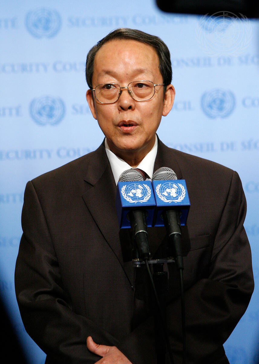 Wang Guangya, Permanent Representative of the People's Republic of China to the United Nations, speaks to correspondents outside the Security Council chamber, at UN Headquarters in New York.
