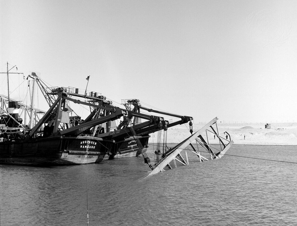 One of the most important obstacles in the Canal was removed on 4 January, when the UN salvage fleet lifted and removed the damaged eastern section of the El Ferdan bridge, 68 kilometers south of Port Said. This photo shows the vessels ""Ausdauer"" and ""Energie"" raising a section of the bridge. January 1957.