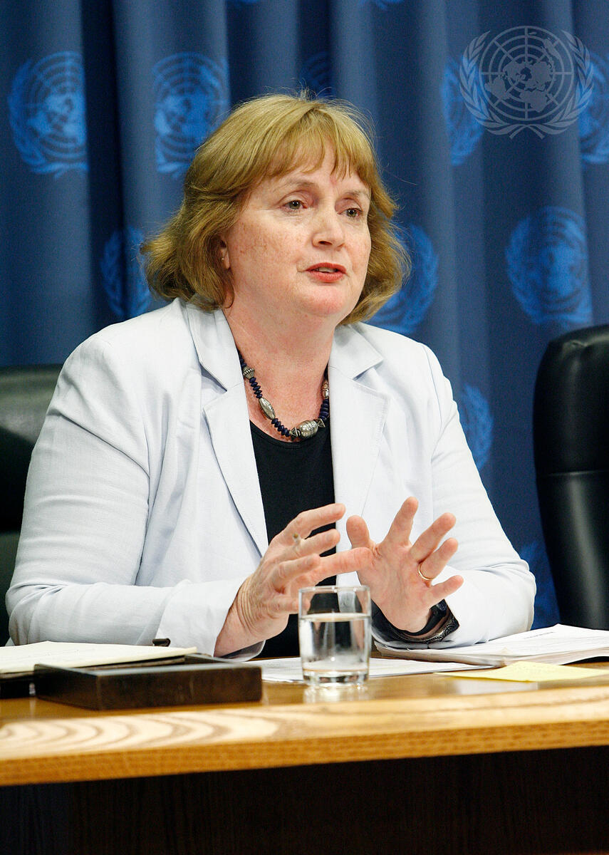 Carolyn Hannan, Director of the Division for the Advancement of Women in the Department of Economic and Social Affairs (DESA), speaks to the journalists about the Secretary-General's report on violence against women, at UN Headquarters in New York.