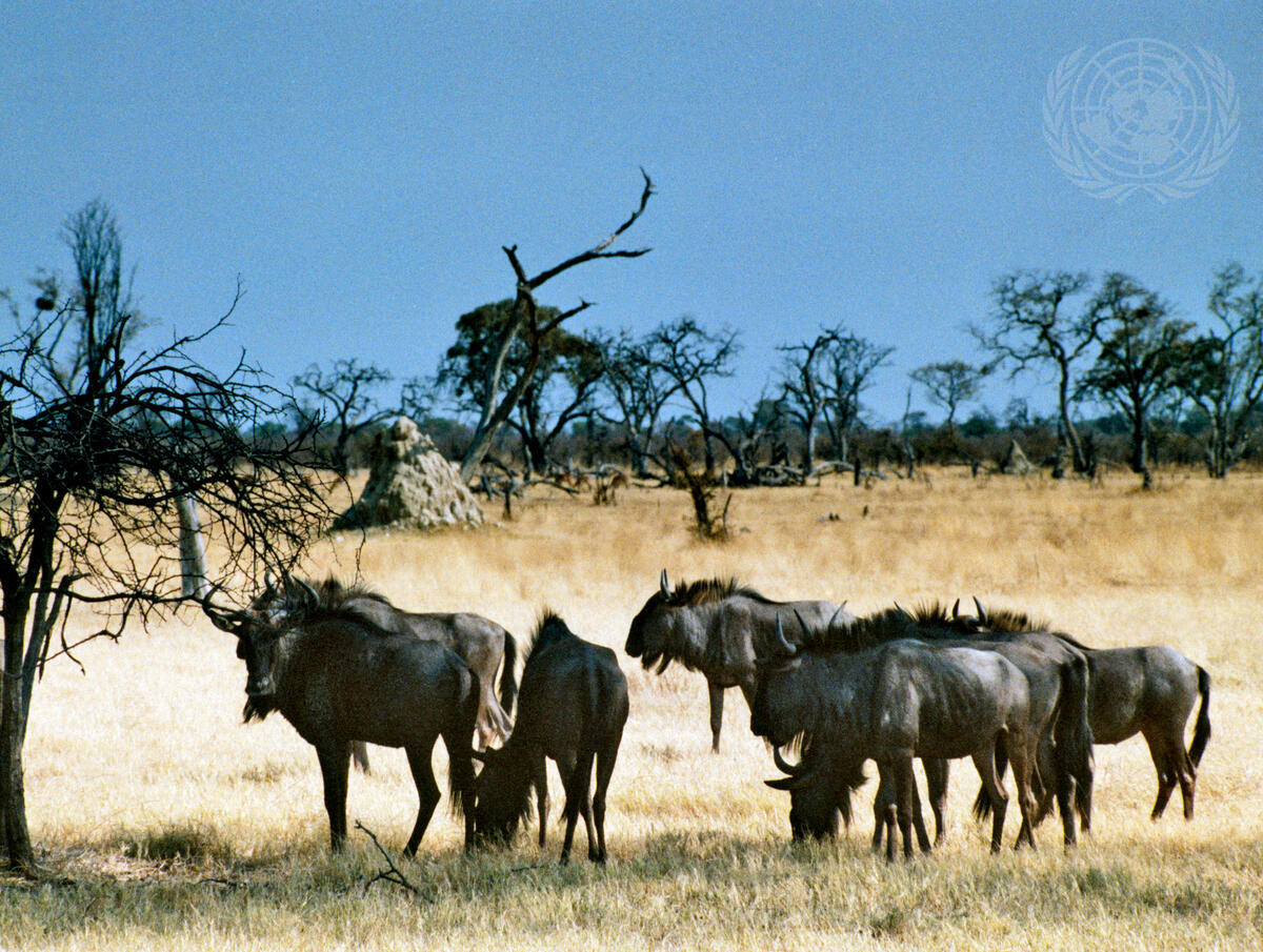 Wildebeest grazing at Savuti Camp, near the border with Zambia. [1984]
