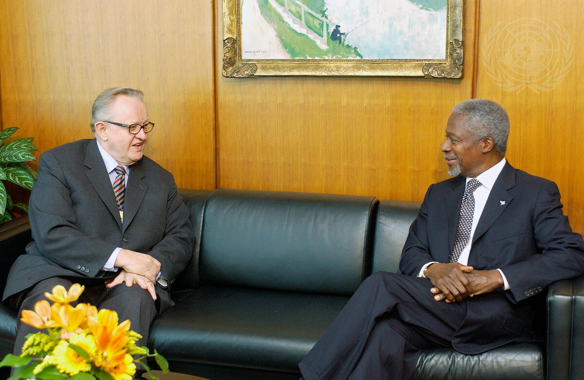 Secretary-General Kofi Annan (right) is pictured with Martti Ahtisaari, former President of Finland, who called on the Secretary-General, today at UN Headquarters.