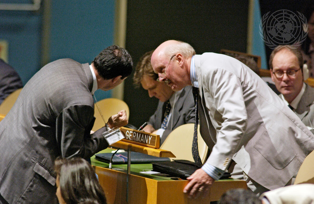 Gunter Pleuger (right), Permanent Representative of Germany to the United Nations, shortly before the 111th plenary meeting of the General Assembly on the question of equitable representation on an increase in the membership of the Security Council, today at UN Headquarters.