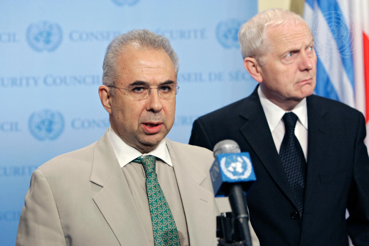 Adamantios Vassilakis (left), Permanent Representative of Greece to the United Nations and President of the Security Council for July, and Emyr Jones Parry, Permanent Representative of the United Kingdom, appear before correspondents today at UN Headquarters shortly after this morning's Security Council meeting which called the terrorist attacks in London earlier in the day ""barbaric"". Through the unanimous adoption of resolution 1611 (2005), the Council unreservedly condemned the attacks and expressed its determination to combat terrorism in accordance with its Charter responsibilities.
