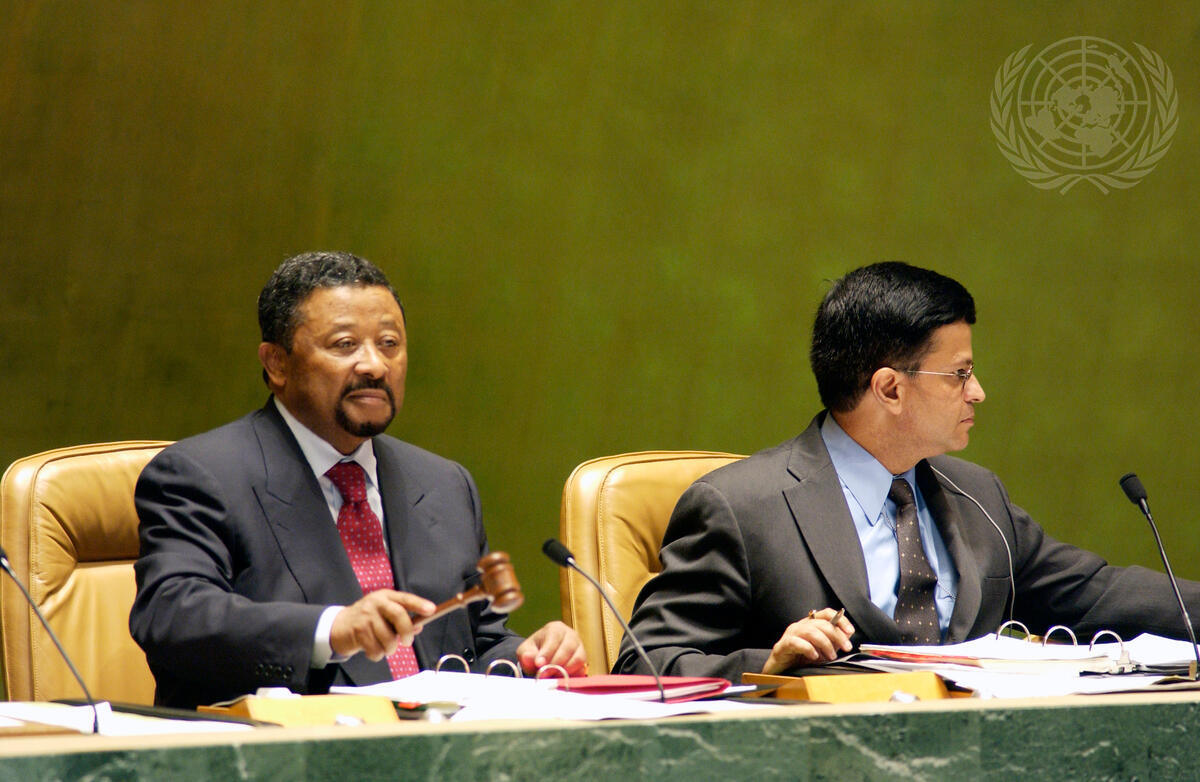 Jean Ping (left), President of the fifty-ninth session of the General Assembly, during the 111th plenary meeting of the General Assembly on the question of equitable representation on an increase in the membership of the Security Council, today at UN Headquarters.