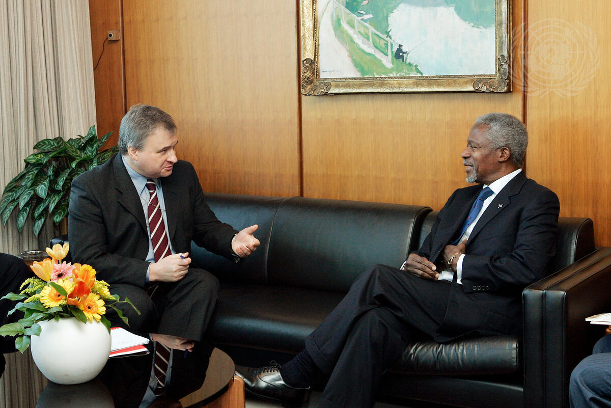 Secretary-General Kofi Annan ( rght) meets with Andrey I. Denisov, Permanent Representative of the Russian Federation to the United Nations and President of the Security Council for November 2005, today at UN Headquarters.